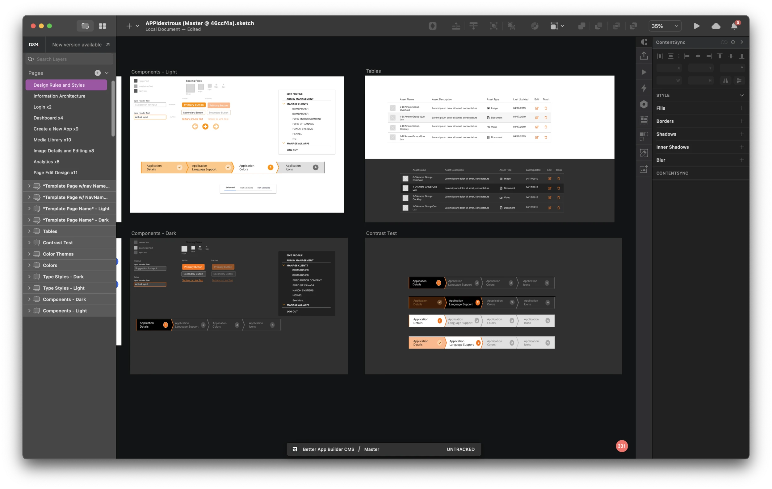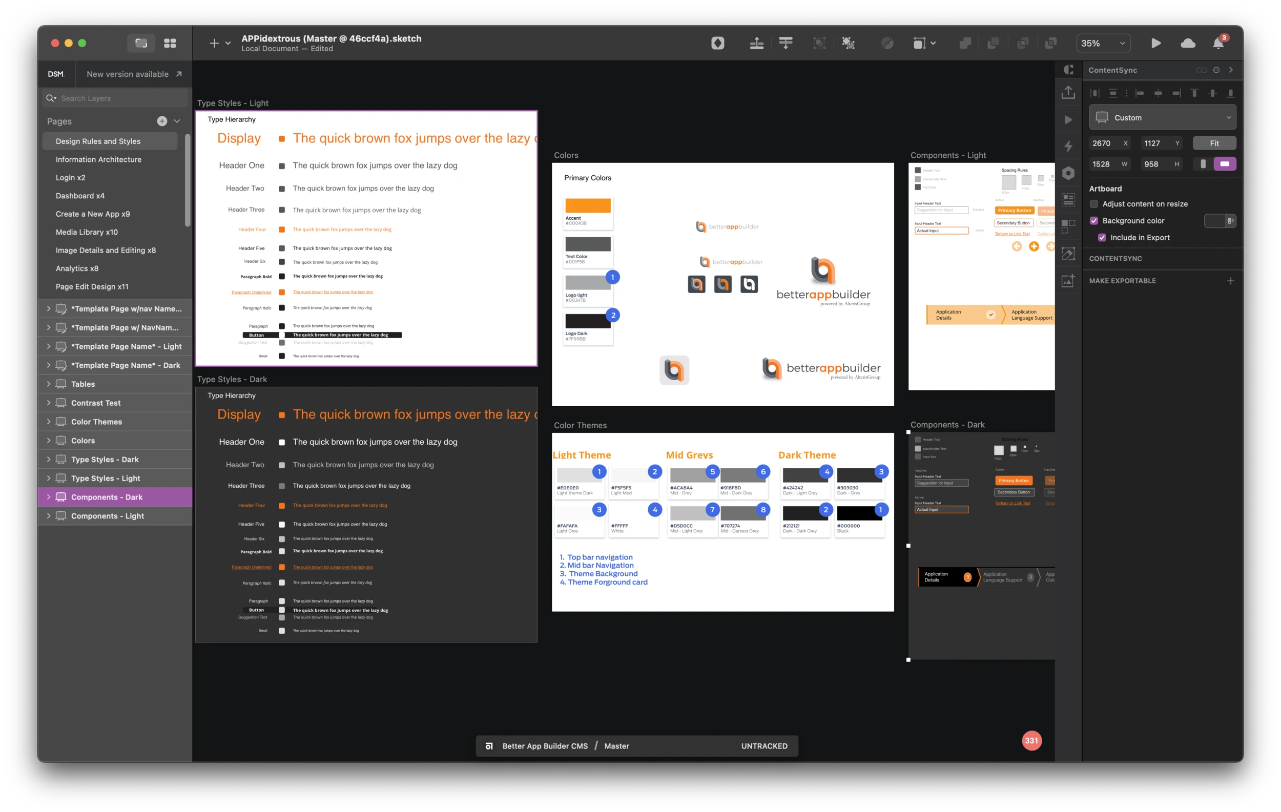 From the onboarding interviews with the development team, I learned they wanted limited deviations as the back-end was already built. The project manager wanted it to be visually appealing enough to show at trade events and loved the idea of a light and dark theme. From there, I started creating light and dark theme components and text styles with appropriate contrast.